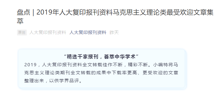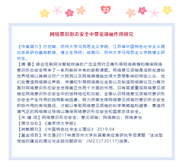 方世南、徐雪闪发表的论文《网络意识形态安全中意见领袖作用研究》入选2019年人大复印报刊资料马克思主义理论类最受欢迎文章集萃