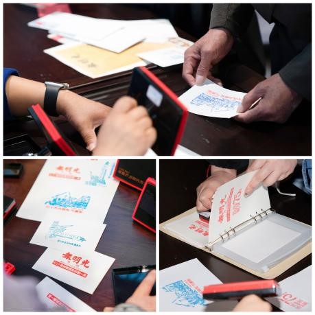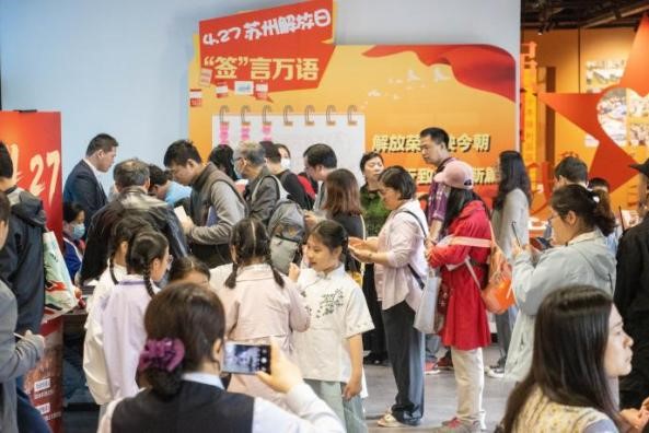 在留言板前,观众纷纷留言,纸短情长,寄托缅怀与希望。盖章台前人头攒动,观众们盖下“苏州解放日”主题印章,以此铭记历史,表达志向,留下一份特别的纪念。
