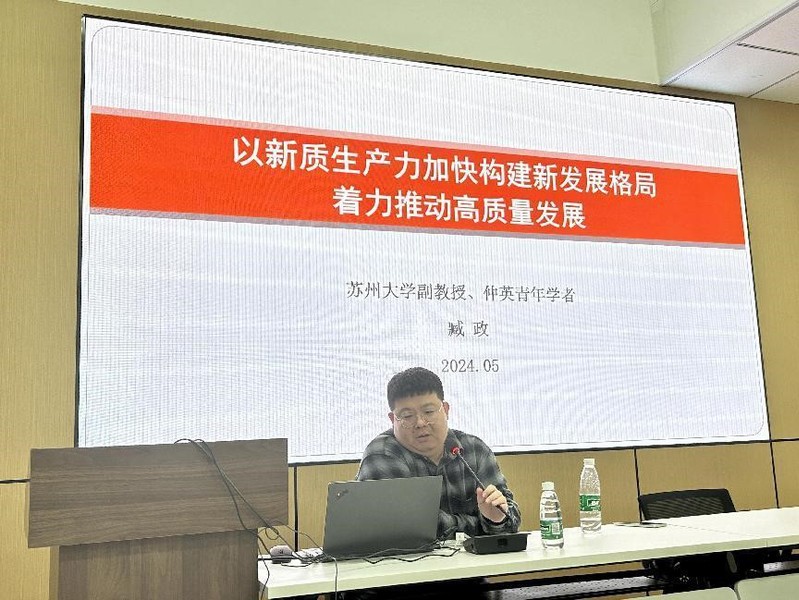 臧政老师以“以新质生产力加快构建新发展格局 着力推动高质量发展”为主题,从准确把握新发展格局的科学内涵、高质量发展是我国现代化建设的首要任务、加快实现高水平科技自立自强三个方面出发,结合实例,给全体学员上了一堂生动的培训课。他强调,新发展格局中创新是灵魂和根本依靠,要坚持创新在国家现代化建设全局中的核心地位,把科技自立自强作为国家现代化的战略支撑。同时,臧政老师指出推动高质量发展要从构建高水平社会主义市场经济体制、建设现代化产业体系、全面推进乡村振兴、促进区域协调发展、推进高水平对外开放等方面着力。