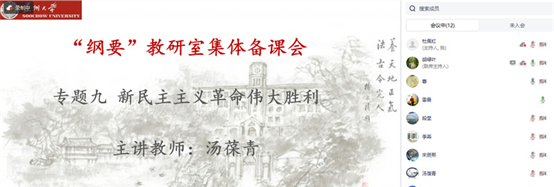 为积极推动党建与思政课堂深度融合,稳步提升思政课教学质量,打造有高度、有厚度、有温度的中国近现代史纲要课,“纲要”教研室于2024年5月19日在腾讯会议平台举行专题教学集体备课会。