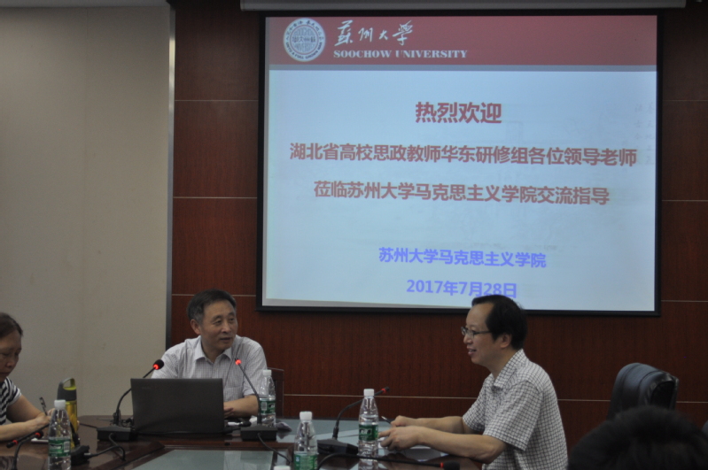 2017年7月29日下午,湖北省高校思想政治理论课教师实践研修班(华东组)一行44人在湖北省教育厅思政处李洁教师、湖北工业大学得宣传部部长李学锋教授、湖北工业大学欧美色情片 院长孙厚权教授带领下来到欧美色情片 “教育部思想政治理论课教师实践研修基地”进行研修活动。欧美色情片 马克思主义院长、博士生导师田芝健教授为研修班作了“苏南区域改革发展于马克思主义理论学科建设”的专题报告。专题报告会由李学锋部长主持。报告会后,欧美色情片 院长田芝健教授、副院长许冠亭教授、院组织人事秘书、马克思主义理论博士后流动站办公室主任李文娟老师等与研修班成员进行了互动研讨交流。会前,田芝健院长、干部欧美色情片 培训中心办公室主任吉启卫等与李洁老师、李学锋部长、孙厚权院长等进行了工作会谈,双方就开展院际合作和开展干部培训跨省协作达成了初步共识,双方表示将进一步进行共同探索,就落实合作共识深入协商。