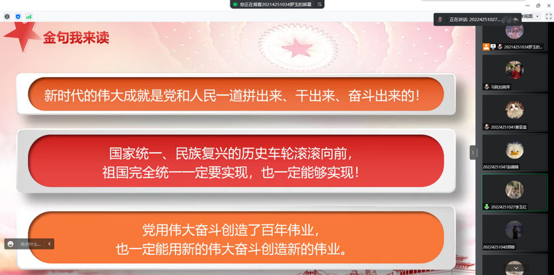 活动伊始,主持人罗玉播放视频《习近平的二十大时间》,并为同学们讲解党的二十大召开的背景及意义。随后,同学们根据《党的二十大报告学习手账》,集中学习了党的二十大报告中的重点内容。李玉红、郝笑妍、洪晨怡等三位团员青年接力朗读党的二十大报告金句,深刻领会党的二十大报告的精髓要义。