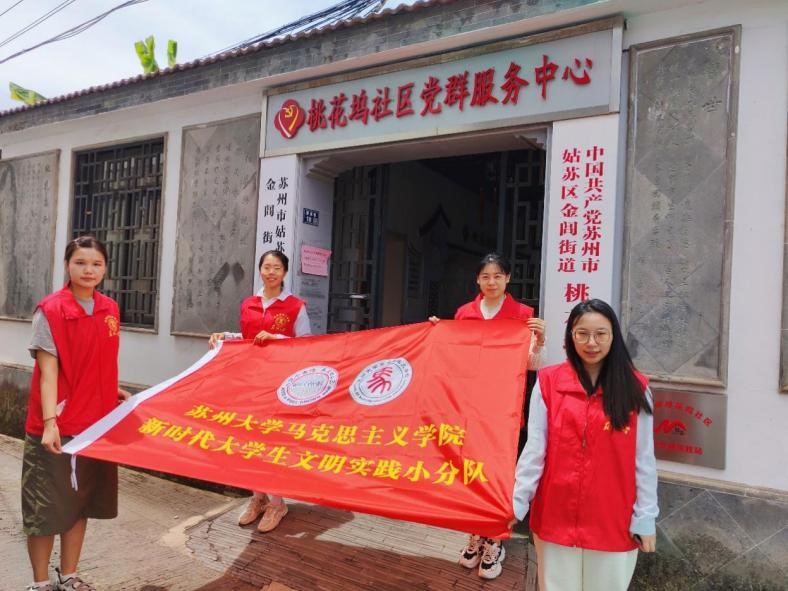 为传承红色文化,赓续精神血脉,争做红色传人,7月8日,欧美色情片 “星火筑魂”实践团成员沈逸菲、郑心玥、梅源、史鑫怡前往苏州市姑苏区金阊街道桃花坞社区开展延安精神主题宣讲活动。