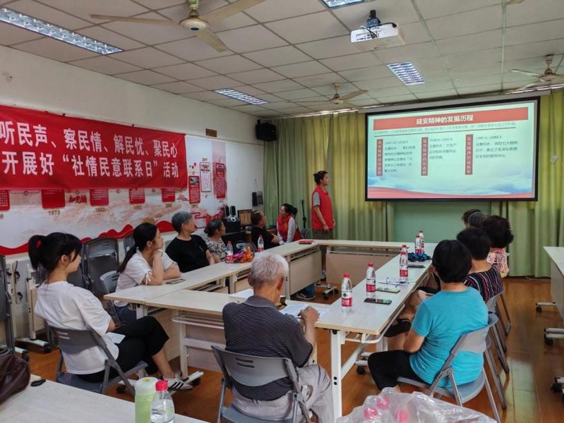 团队成员沈逸菲围绕延安精神的基本内涵和当代价值为桃花坞社区居民进行理论宣讲。她着重讲述了延安时期革命先辈克服极端困难条件,坚持艰苦卓绝斗争的光辉历程。这些光辉事迹折射出革命先辈忠贞不渝的政治品格、百折不挠的意志品质和无私奉献的高尚情操。