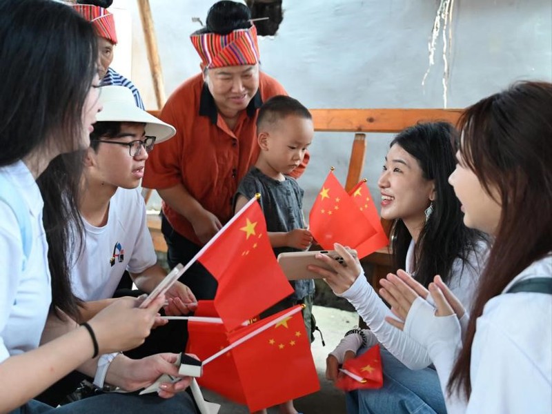 图:实践团成员调研途中与苗族留守儿童传唱红歌