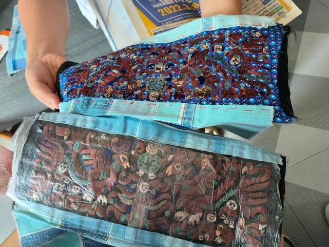 苗族服饰作为文化艺术瑰宝,是苗族文化传承重要载体,成为苗家儿女“穿在身上的史诗”。为深入了解苗族服饰,实践团成员现场观看小河村苗服织锦、亮布的制作过程,并身穿村民手作苗服,近距离感受施洞苗绣、银饰的魅力,在与村民交流中了解苗族衣冠制作技艺以及苗服图腾纹样的价值与文化内涵。