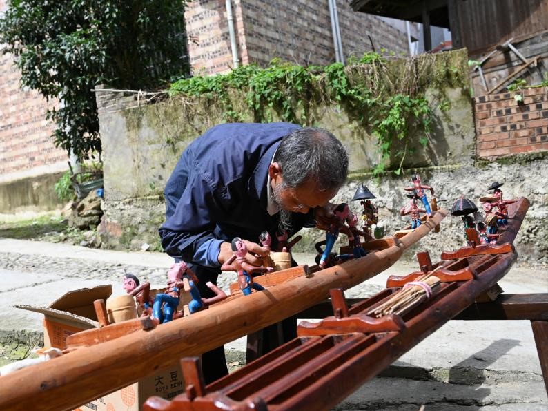 木雕艺术作为中国独有的文字符号,是经过时代传承后遗留下的艺术瑰宝,志愿者为此拜访台江县小河村苗族木雕技艺的非遗传承人杨再福老先生。年近八旬的杨老现场还原他的代表作——龙舟雕刻,并绘声绘色向实践团介绍他的作品创作历程与当地苗族雕刻传承历史。实践团了解到杨老多年来一直坚持独木龙舟龙头雕刻,在交流中,老先生时不时流露出对苗族雕刻的热爱以及坚守非遗文化的决心,更是深深打动了在场的实践团成员们。