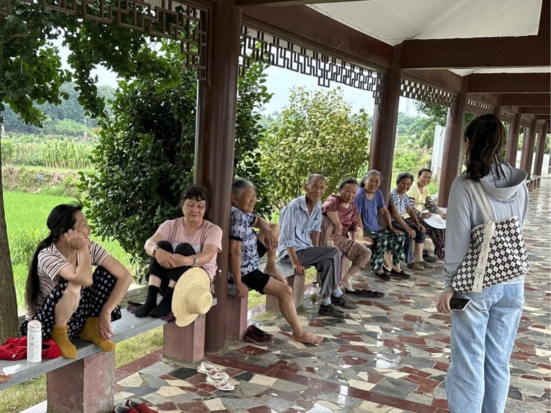 图:实践团成员方晶晶与村民在议事长廊话谈