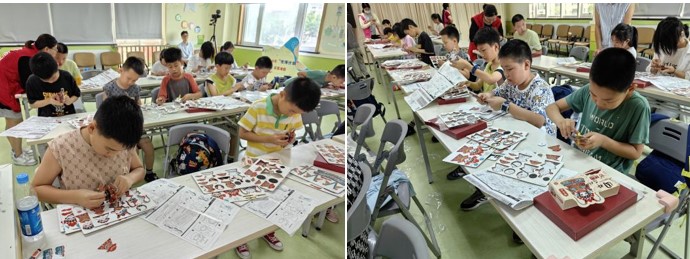 随后,志愿者细致入微地介绍了京剧角色——刀马旦的模型制作流程。从材料挑选到部件拼接,志愿者一一耐心演示,孩子们则围坐一旁,全神贯注地聆听,急切地期待着亲自动手。在动手制作环节,孩子们发挥无限创意,借助小组合作与实践团队成员的指导,将原本平面的材料巧妙地组合成了一个个栩栩如生的立体刀马旦卡通形象。每个小朋友都精心打造出了专属自己的刀马旦人物模型。