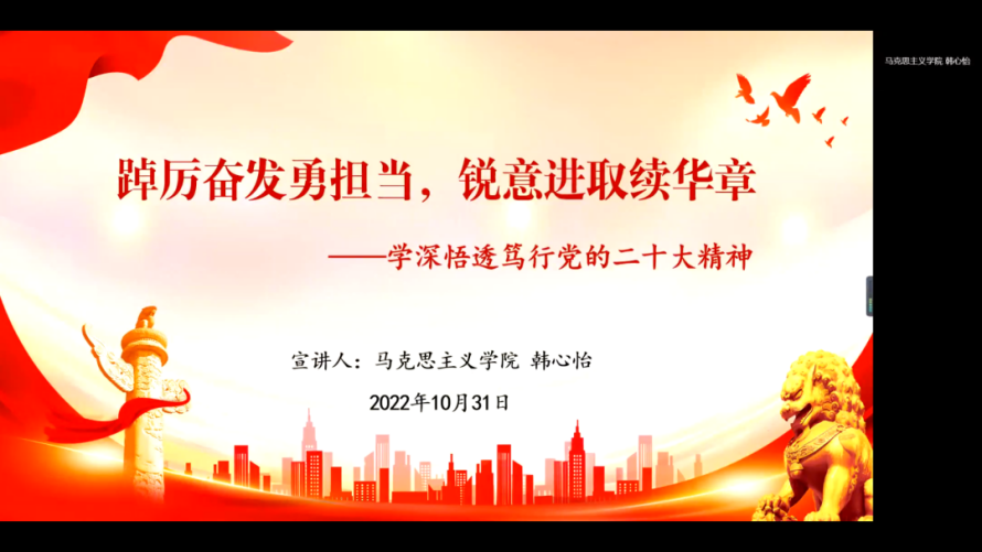 会议伊始,刘娴琳介绍了本次活动举办的目的与意义。活动紧紧围绕学习党的二十大精神展开,引导广大青年学子认真领悟党的二十大提出的新思想新论断、作出的新部署新要求,团结带领广大青年学子坚定理想信念,勇挑时代重担,谱写新时代青春之歌。
