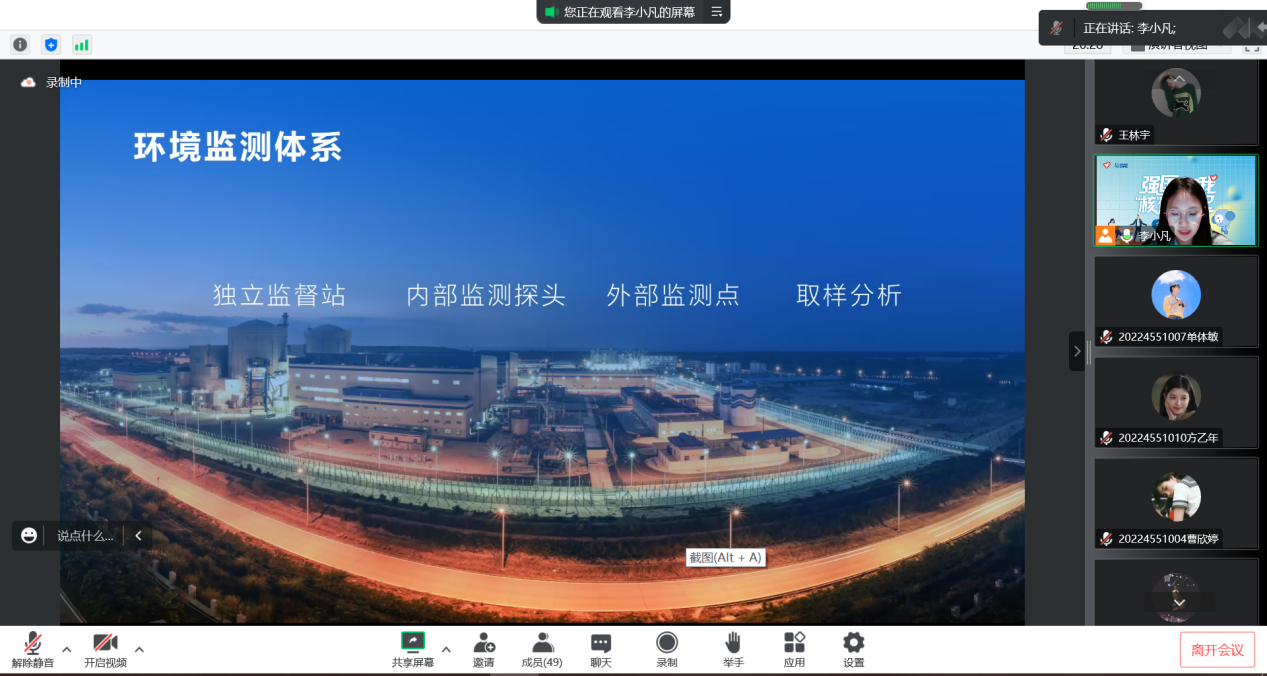 2021级硕士研究生李小凡为此次宣讲活动主讲人。她带领同学们了解生活中辐射的相关知识,区分了天然辐射与人工辐射的不同存在形式。面对“辐射对人体有危害吗?”这一问题,李小凡指出,当短时辐射物质摄取量低于100毫西弗时,对人体没有危害,如果这个数字超过100,就会对人体造成危害,摄取量高于4000毫西弗时,则有致命的危险。李小凡向同学们介绍了中国核技术在工业、农业、医学、环境、安保等方面的广泛应用,解读了中国核工业的精神谱系,让同学们更加深刻地体会到中国核工业发展的不易与伟大。