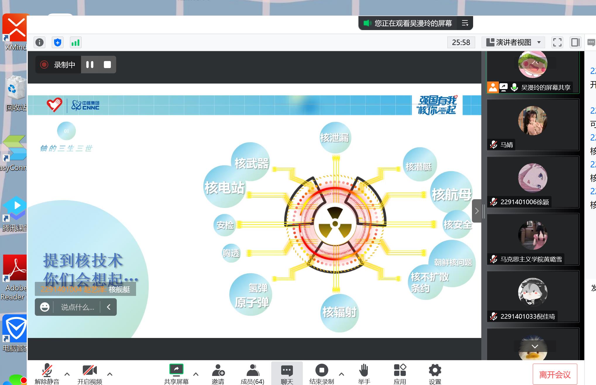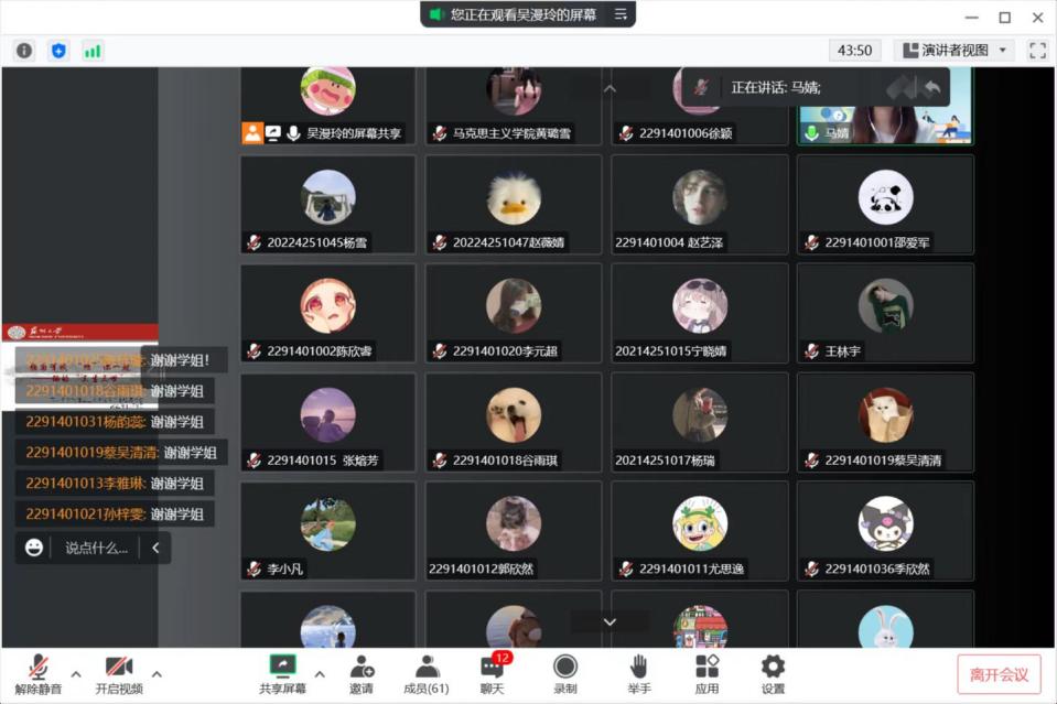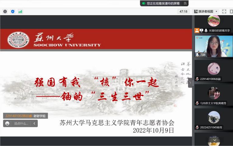 与会同学积极进行互动交流。2022级本科生张蔓云针对“核工业的发展历程”分享了自己的感想;2021级硕士生李小凡、黄璐雪分别对“获得实用铀棒核能的主要方式”“生产铀的第一步”作了介绍;2021级硕士生王林宇分享了“铀的分离”相关知识。