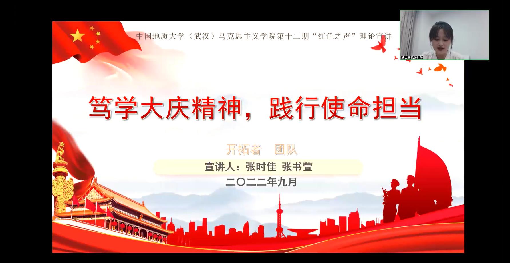中国地质大学欧美色情片 的开拓者团队成员张时佳以“笃学大庆精神 践行使命担当”为主题进行宣讲。宣讲中,她围绕大庆精神,为同学们重点介绍了其形成背景、发展过程和内涵意义。她表示,大庆精神承载了我们党波澜壮阔的革命史、艰苦卓绝的奋斗史和可歌可泣的英雄史,蕴含了坚定的理想信念、崇高的革命精神和高尚的人格魅力。宣讲最后,她号召同学们坚定理想信念,振奋精神,为中华民族伟大复兴增添新的荣光。
