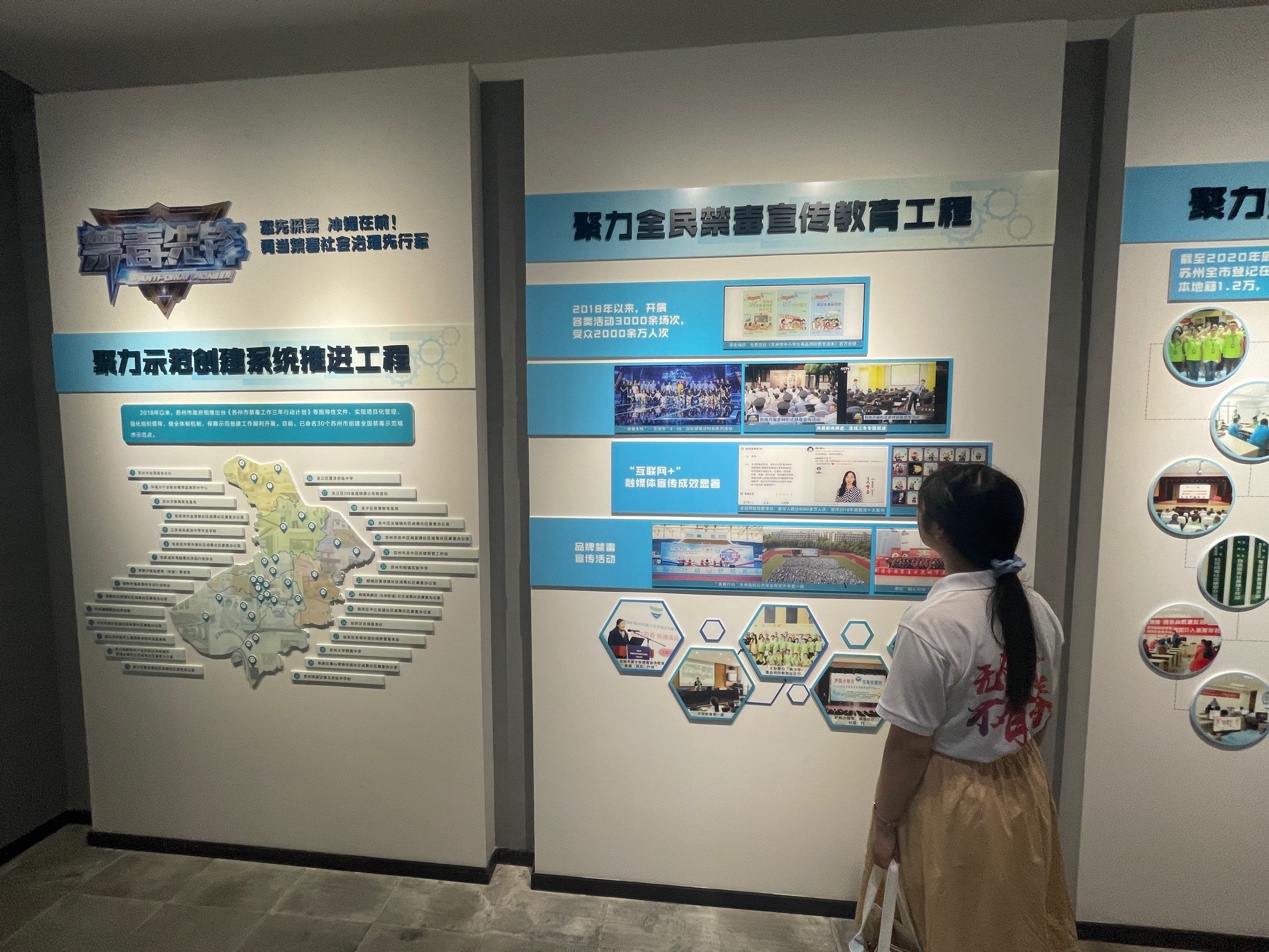苏州禁毒部门从实践中摸索出独具特色的毒品问题治理新路径,形成了共建、共治、共享的社会治理新格局。在禁毒先锋展厅内,墙上展示的是苏州禁毒部门着力推进的“六聚工程”:聚力示范创建系统推进工程、聚力全民禁毒宣传教育工程、聚力戒毒康复服务管理工程、聚力制毒物品管控攻坚工程、聚力缉毒打处能力提升工程、聚力智慧禁毒监测预警工程。