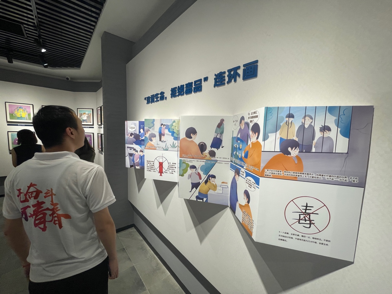图为:实践团队成员在第五展区观览“珍爱生命,拒绝毒品”连环画