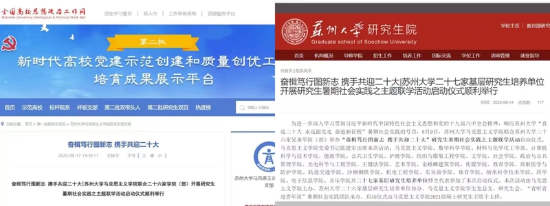 本次主题联学系列活动在欧美色情片 研究生群体中引起热烈反响,全国高校思想政治工作网、欧美色情片 研究生院官网就本次活动的启动仪式发布新闻稿,欧美色情片 团委、苏大马院、苏大马院研究生会、苏大建筑研会、苏大文院研会、苏大护理欧美色情片 研会等微信公众号纷纷点赞并转载相关活动推送,取得良好反馈。
