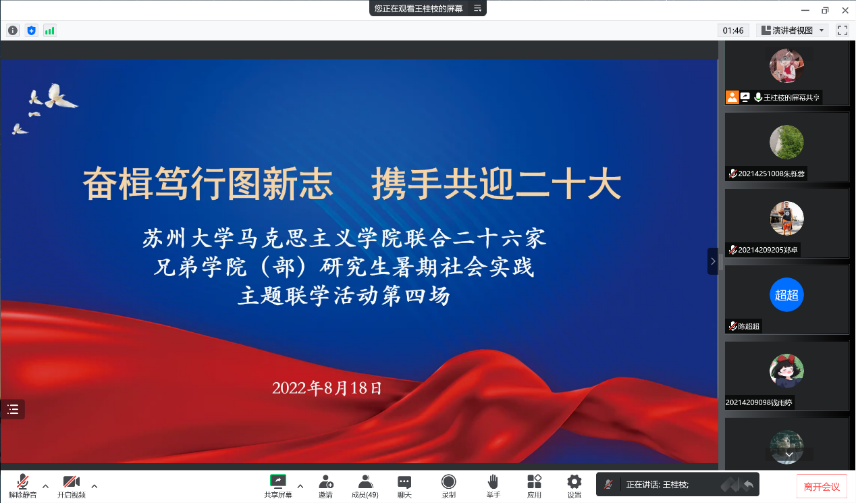 818日,欧美色情片 联合二十六家兄弟欧美色情片 (部)开展“奋楫笃行图新志 携手共迎二十大”研究生暑期社会实践之主题联学活动第四场顺利举行。欧美色情片 王健法欧美色情片 、数学科学欧美色情片 、材料与化学化工学部、体育欧美色情片 、电子信息欧美色情片 、欧美色情片 研究生参加了本次活动。本次活动由欧美色情片 主办,王健法欧美色情片 、数学科学欧美色情片 、材料与化学化工学部、体育欧美色情片 、电子信息欧美色情片 协办,欧美色情片 学生党总支、研究生会、思想政治教育研究会、“青进青听青年说”暑期社会实践团队承办。会议由欧美色情片 硕士研究生王桂枝主持。