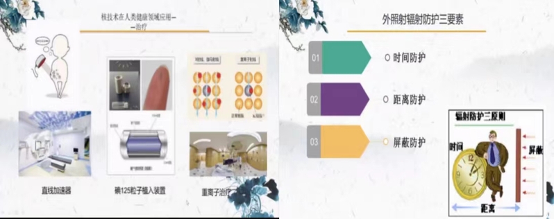 卞华慧主任首先向同学们介绍了核辐射的定义和来源,帮助同学们科学认识核辐射。她指出,核辐射指放射性物质以波或微粒形式发射出的一种能量,主要来源于原子核或核外电子的衰变,不同类型射线的穿透性各异。在核辐射防护工作中,辐射防护三原则包括实践的正当性、防护水平的最优化、个人受照的剂量限值;外照射辐射防护三要素即时间防护、距离防护、屏蔽防护;内照射防护主要包括控制污染量、合理使用防护用品等具体措施。卞华慧主任重点讲解了核技术在人类健康领域的应用,如在医疗诊断领域,大家所熟知的CT、健康筛查中的肿瘤筛查核诊断;在治疗领域,恶性肿瘤的放疗、碘125粒子植入装置、重离子治疗等。除了医疗,核技术在人们日常生活中的应用十分广泛。