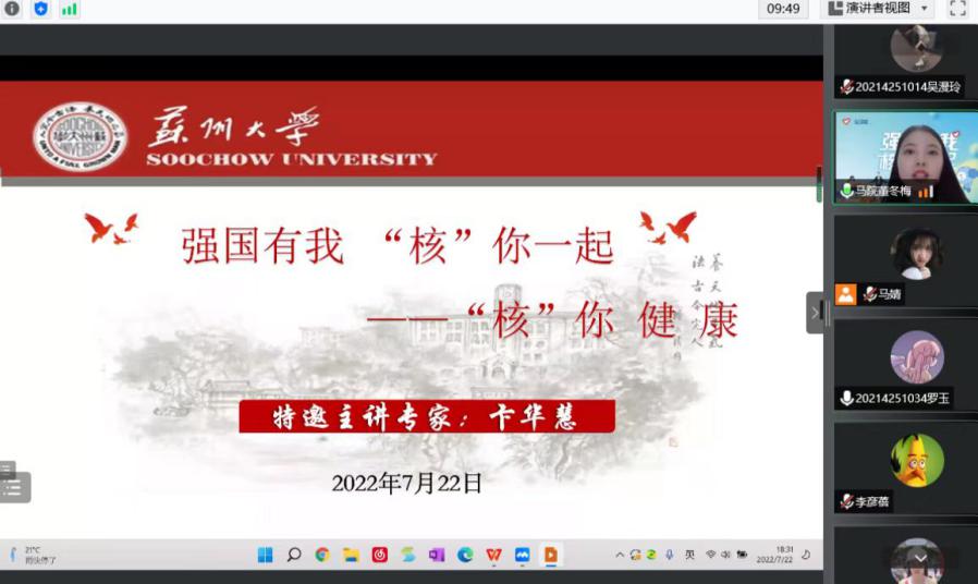 在互动交流环节,周蔚然、马婧、胡新媛等同学就核污染等问题进行了提问,卞华慧主任回答大家,有关放射性废水排放需要以排放量评估最终造成的影响,因此人们不必感到过分恐慌。在听过卞华慧主任的解答后,同学们不仅解决了心中的疑惑,也对核污染事件有了更深层次的认识。与会同学们积极分享学习心得,刘冰心表示,作为新时代的青年学子有义务加入到核科普的队伍中来,让更多人了解核、接近核,逐步消除对核知识的神秘感。吴漫玲指出,通过本次学习得知盲目地采用错误防护措施难以达到真正防辐射效果,反而会加重辐射损伤,所以大家要正确认识核辐射、了解核科技,明白如何能更好的利用核技术促进社会发展。