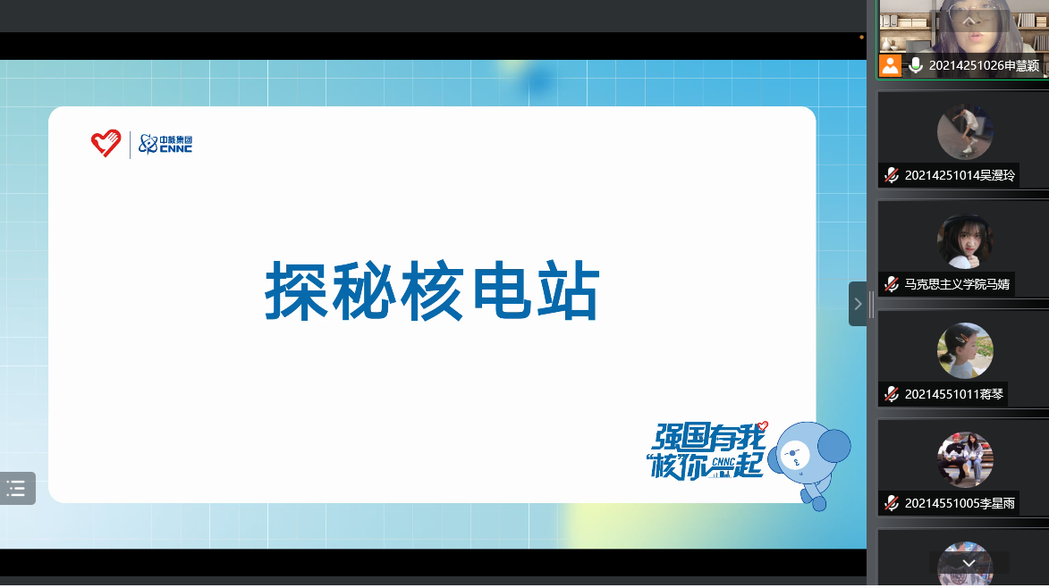 2021级硕士研究生申慧颖为本次活动宣讲人。在本次宣讲中,申慧颖同学主要从能源、核的起源、核能发电、几种堆形、辐射、核电站以及核电效能这七个部分来为大家探秘了核电站的世界。使在场同学深刻认识到推动能源革命,积极安全有序发展核电,是实现碳达峰、碳中和的重要举措,激励同学们践行简约适度、绿色低碳、文明健康的生活方式。