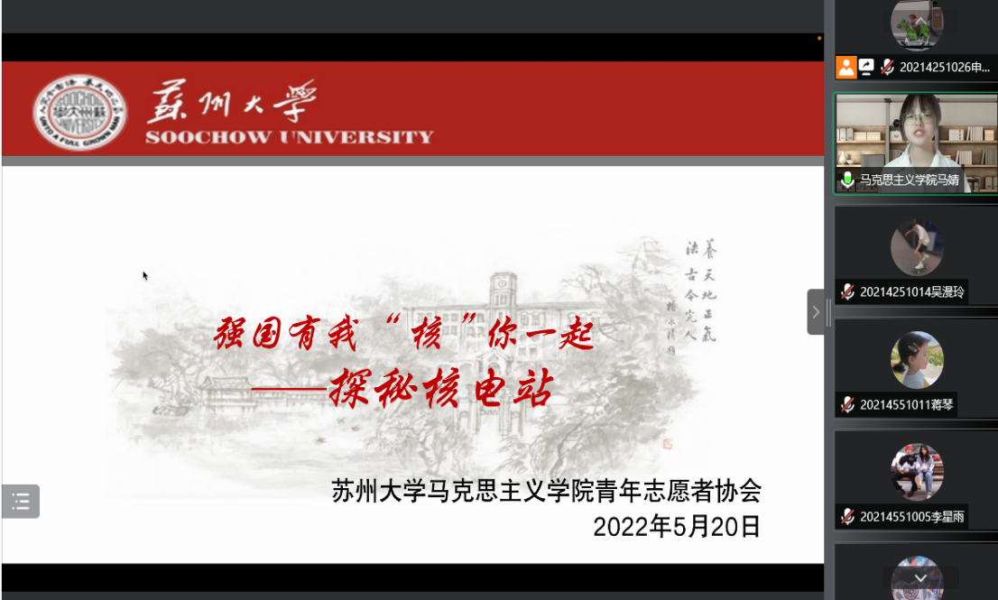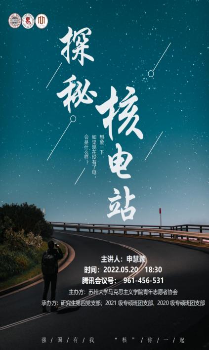 5月20日,欧美色情片 青年志愿者协会宣讲团顺利举办“探秘核电站”主题宣讲活动。本次宣讲活动由欧美色情片 青年志愿者协会主办,研究生第四党支部、2021级专硕班团支部、2020级专硕班团支部承办。活动由2021级硕士研究生马婧主持。