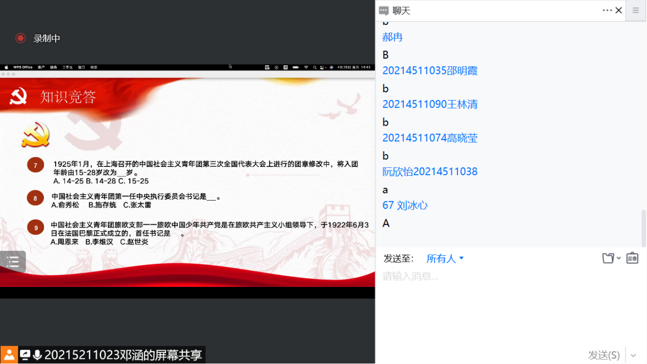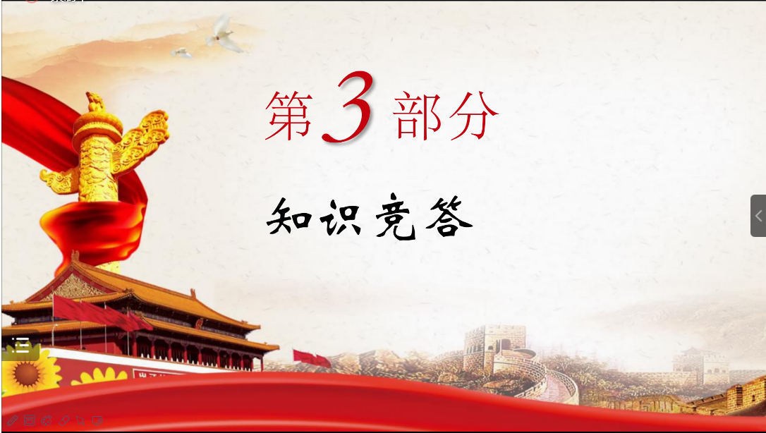 在“知识竞答”环节,围绕中国共产主义青年团的创建过程和艰苦奋斗史,同学们以分组竞答和自由抢答的方式进行答题,竞答过程中同学们热情高涨,表现出了优秀的团史知识储备水平和思维能力,充分展现出了青年团员的青春活力。