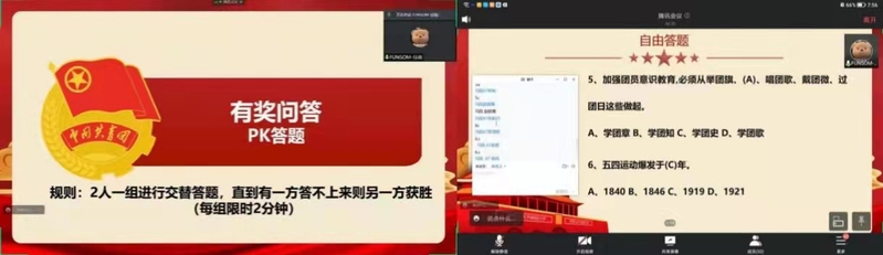 在知识竞答环节,围绕中国共产主义青年团的创建过程和艰苦奋斗史,同学们通过分组pk和自由抢答的方式进行答题,竞答过程中同学们积极热情,表现出了优秀的团史知识储备水平和思维能力,充分展现出了青年团员的青春活力。