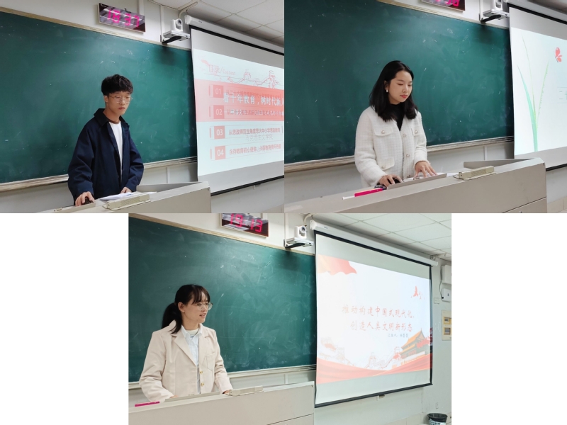 2022级硕士研究生分别进行主题报告。周浩南以“看十年教育,树时代新人”为主题,立足党的二十大报告,详细解读了科教兴国在中国式现代化中的重要意义。张亚静着眼于习近平生态文明思想,以“建设人与自然和谐共生的美丽中国”为主题进行汇报,并以家乡山西为例,展示了山西在生态文明领域的发展战略和发展成果。柏莹莹在“推动构建中国式现代化,创造人类文明新形态”主题报告中重点阐述了中国式现代化的本质内涵和实践路径。