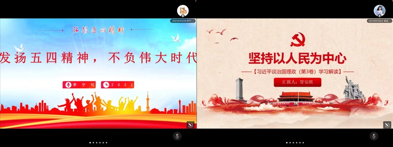 李宁可同学以“发扬五四精神不负伟大时代”为主题,从五四精神的具体内容、价值意蕴、新时代的青年使命以及争做新时代有为青年四个方面进行了具体阐述,她呼吁当代青年要努力成为有理想、有学问、有才干的实干家,在新时代成就一番事业。管安琪同学着眼于《习近平谈治国理政》第三卷中的“以人民为中心”,分析了以人民为中心的生成逻辑、价值彰显、内在意蕴和实现手段,生动讲述了习近平新时代中国特色社会主义思想鲜明的人民性理论品格。薛阅兵同学以“共同筑牢网络安全防线奋力推进网络强国建设——习近平网络强国重要思想探究”为主题,介绍了习近平网络强国思想的产生背景、科学定位、重大意义和丰富内涵,并着重强调了其对高校学生的实践要求,即始终保持政治清醒,自觉抵制谣言,提升网络素养。