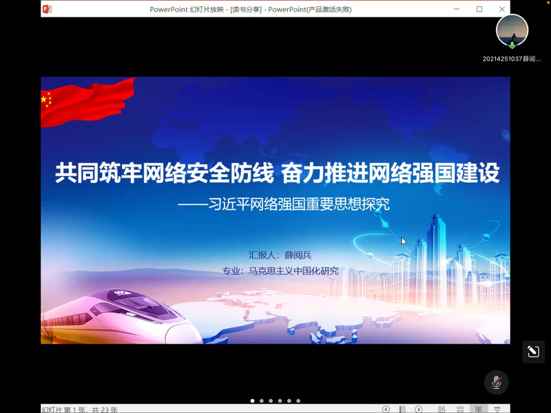 与会同学积极交流。李婷玉同学表示,作为新时代的青年,我们要坚定理想信念,厚植爱国情怀,锤炼高尚品德,担当时代大任,为中华民族伟大复兴做出自己的贡献。李雪霜同学十分赞同薛阅兵同学分享的关于建设网络强国的观点,认为当代青年应当提高辨别信息的能力,自觉抵制不良信息,在关键时刻敢于斗争、敢于亮剑,坚定立场观点。