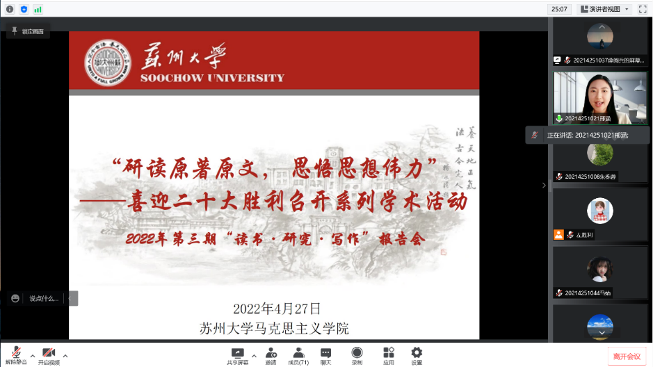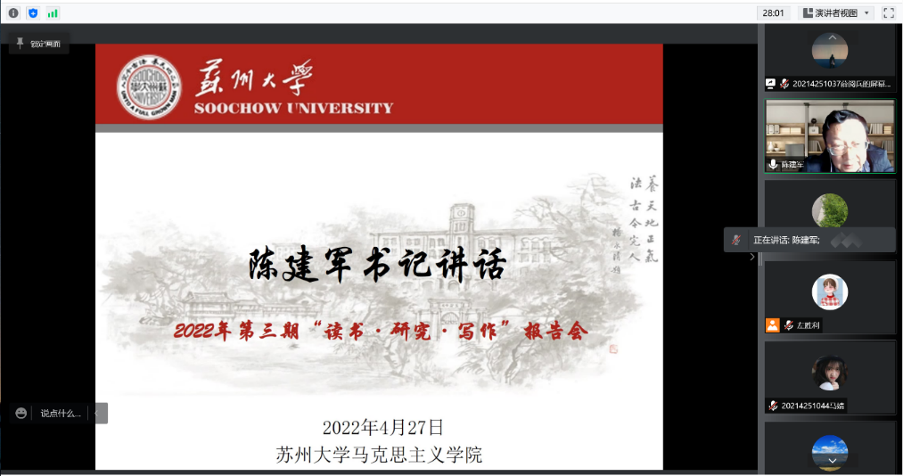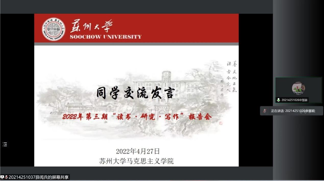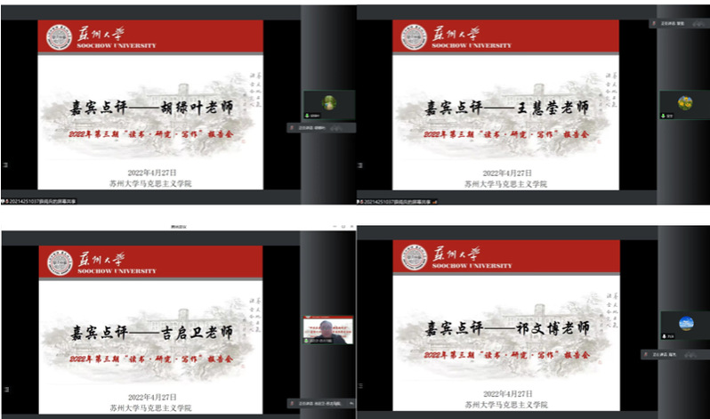 4月27日,欧美色情片 在线举办了2022年第三期“读书·研究·写作”报告会,报告会集中研读《习近平谈治国理政》第二卷,深入学习习近平新时代中国特色社会主义思想。欧美色情片 党委书记陈建军,党委副书记、院长田芝健,“纲要”教研室党支部书记、“思政名师工作室”行动党支部书记胡绿叶,马克思主义政党与国家治理研究中心副主任、“研究生思政课教学改革”行动党支部书记吉启卫,硕士研究生思政课教研室副主任、马克思主义政党与国家治理中心研究员王慧莹,师资博士后、形势与政策教研室副主任祁文博等作为特邀嘉宾出席本次报告会并作点评指导。本次活动由欧美色情片 思政名师工作室(思政田园)、江苏省中国特色社会主义理论体系研究中心苏大基地主办,欧美色情片 研究生会、思想政治教育研究会、习近平新时代中国特色社会主义思想研究会承办。