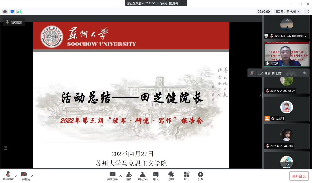 田芝健院长对本次报告会进行总结。他对同学们的分享主题与内容给予充分肯定,并希望同学们把学习、研究、贯彻习近平新时代中国特色社会主义思想有机结合,把研读《习近平谈治国理政》第三卷和研读马克思主义经典原著相结合,不断深化对真理的探求,用习近平新时代中国特色社会主义思想武装头脑、指导学习生活和研究工作,指导成长成才。最后,田院长提醒同学们严格执行疫情防控要求,养成良好生活作息习惯,保持与导师和欧美色情片 之间的沟通,珍惜时光,不断前行!