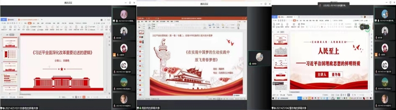 周蔚然同学以“在实现中国梦的生动实践中放飞青春梦想”为主题,从中国梦与青年的关系、青年如何在实践中放飞青春梦想、共青团与青年模范的作用以及习近平总书记对青年的寄语四个方面进行了解读。关春艳同学以“习近平全面深化改革重要论述的逻辑”为主题,介绍了全面深化改革的时代背景,依次分析了全面深化改革的理论逻辑、历史逻辑和实践逻辑。董东梅同学以“人民至上——习近平治国理政思想的鲜明特质”为主题,介绍了人民至上的理论背景,从人民至上的执政理念依据和思想理论体系两个方面阐述了习近平治国理政思想的鲜明特质,并以习近平总书记的实践考察案例和同学们一起体会了习近平总书记对人民群众的深刻情感。