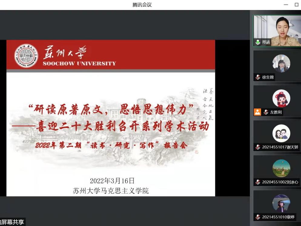 在线举办了2022年第二期“读书·研究·写作”报告会。本次报告会以“研读原著原文 思悟思想伟力”为主题,集中研读《习近平谈治国理政》第一卷,加深对习近平新时代中国特色社会主义思想的学习研究理解和运用,进一步深化对“两个确立”决定性意义的认识,坚决做到“两个维护”,推动马克思主义理论学科研究生把对当代中国马克思主义、21世纪马克思主义原著原文原理的研读引向深入。院长田芝健教授,院务监督委员会主任、博士生导师姜建成教授,教学科研办公室主任李文娟、青年教师顾梦婷等作为特邀嘉宾出席本次报告会并作点评指导。本次活动由院学生党总支、院研究生会、思想政治教育研究会承办。报告会由2021级硕士研究生邢涵主持。