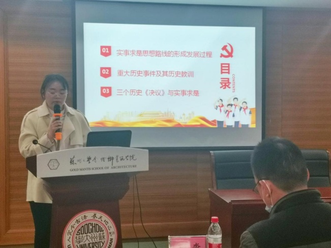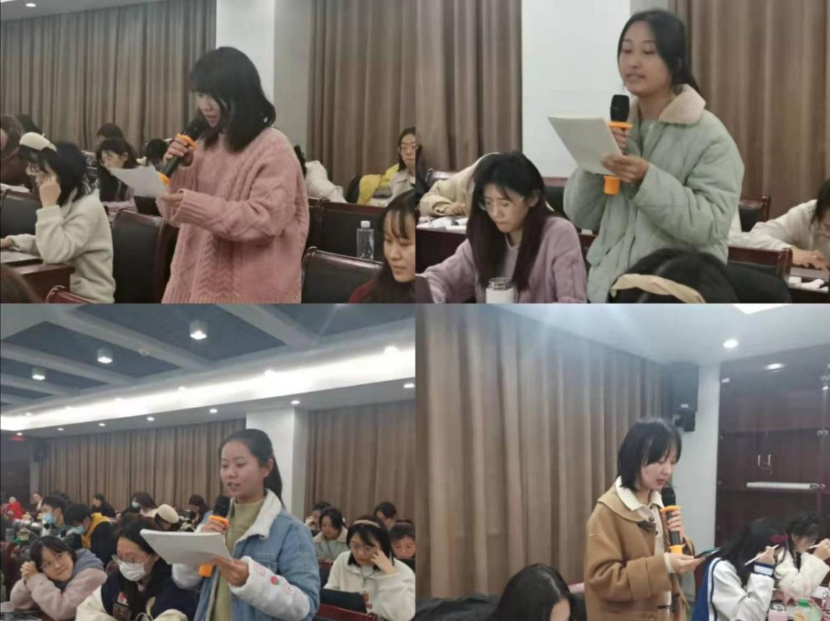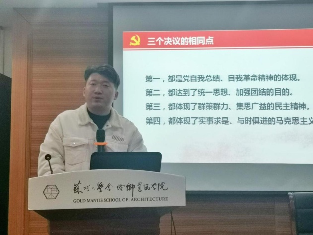 2021级硕士生左胜利同学以“实事求是:百年大党铸就辉煌的法宝”为主题,从三个历史决议中实事求是高频词的出现得出结论:“实事求是”是我们党铸就辉煌和再创辉煌的法宝。2021级硕士生李雪霜同学以“‘十个明确’对‘八个明确’的发展”为主题,着重对比了“十个明确”和“八个明确”表述的“变”与“不变”,并从逻辑表达、理论表述和实践指向上阐述了“十个明确”的重大意义。2021级博士生林心杰以“从三个历史决议看三个‘飞跃’”为主题作了报告,从马克思主义中国化三个理论性飞跃的历史进程中阐述了历史决议产生的必然性和必要性,并在此基础上指出新的决议有着更宽广的历史视野、更深刻的思想理论和更全面的战略思维。